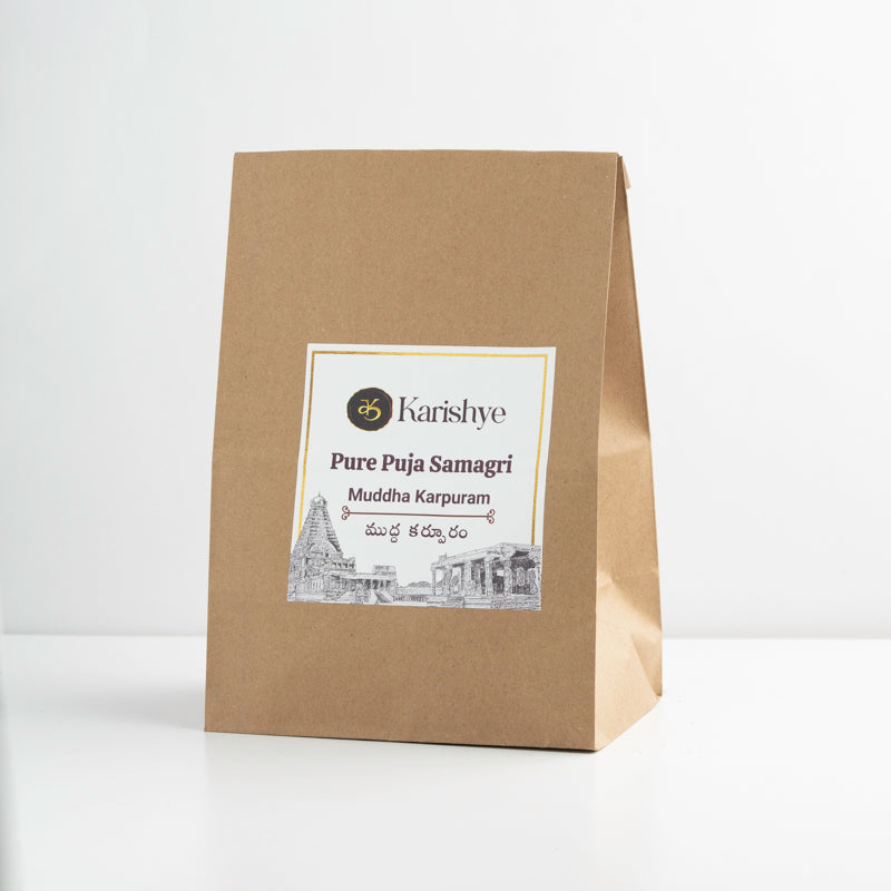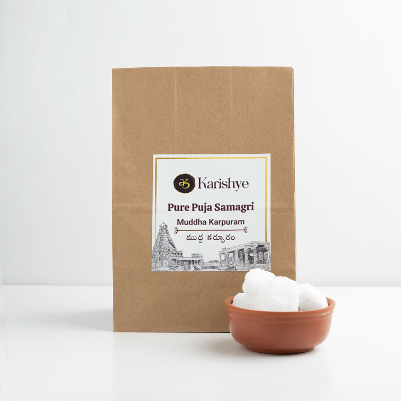 Mudha Karpooram / ముద్ద కర్పూరం (Edible Camphor) holds great spiritual and medicinal significance in Hindu traditions. Known for its divine fragrance and purifying properties, it is widely used in religious ceremonies and sacred offerings. In poojas, Mudha Karpooram is used in naivedyam, especially in preparing prasadam like sweet dishes, enhancing their purity and aroma. It is also an essential element in aarti, where its sacred fumes purify the surroundings and invite divine energy. Edible camphor is believed to remove negative energies, promote mental clarity, and uplift spiritual consciousness.